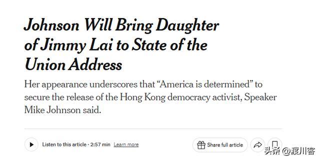 进入2026年,美国干预力度进一步升级。2月24日,美国众议院议长约翰逊公开宣布邀请黎智英女儿黎采出席特朗普的国情咨文演讲。